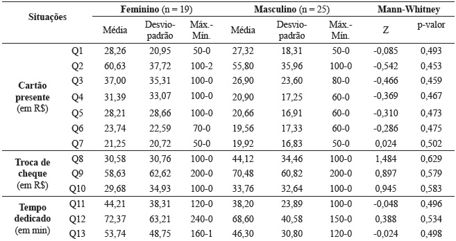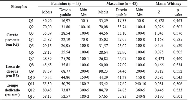 Para verificar a influência do gênero na tomada de decisão financeira dos alunos por curso, também foi executado o teste de Mann-Whitney, para cada questão. Nas Tabela 3 e 4, são apresentados os resultados obtidos, assim como a estatística descritiva dos resultados por gênero.