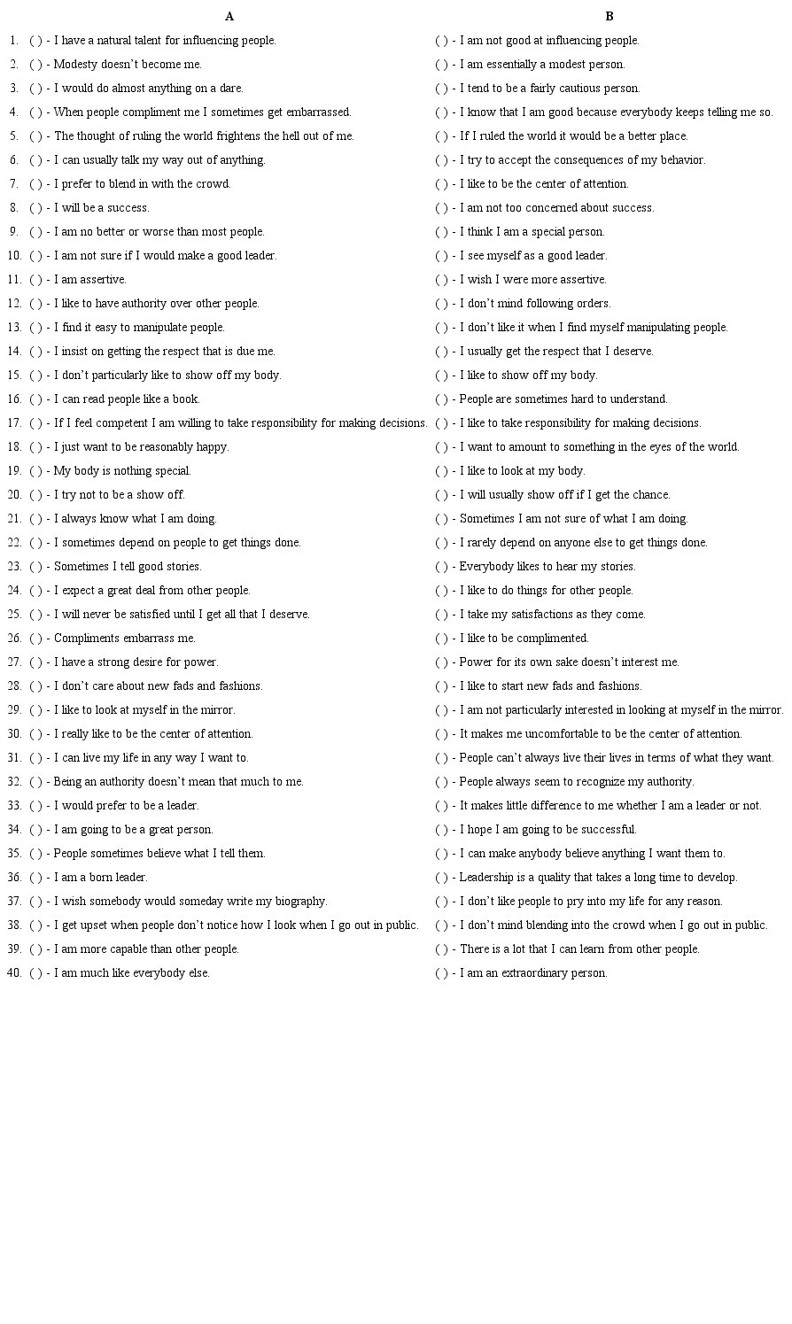 In each one of the following pairs of attitudes, choose the statement from column A or B that best suits you. Indicate your answer by marking one item for each number. There are no right or wrong answers. Please, answer based on your beliefs and not in the way you think you should in order to present a good image to the researcher. Mark only one answer for each pair of attitudes and, PLEASE, DO NOT SKIP ANY OF THE ITEMS.