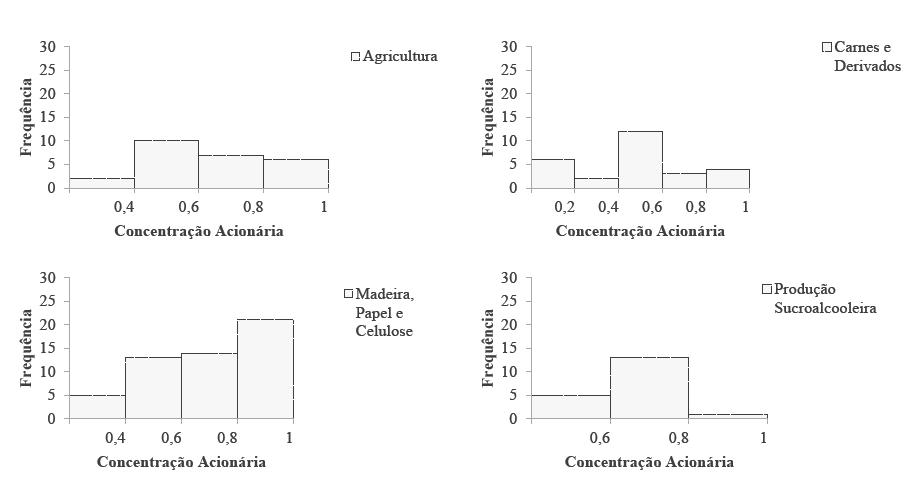 Destaca-se que a concentração varia com o setor (ver histogramas no Apêndice B). Os segmentos de maior concentração de capital são os de Madeira, Papel e Celulose e Produção Sucroalcooleira. O segmento que possui maior dispersão, relativamente, é o de Carne e Derivados, porém, a concentração de capital ainda é expressiva, com maior frequência de empresas nas concentrações superiores a 60%.