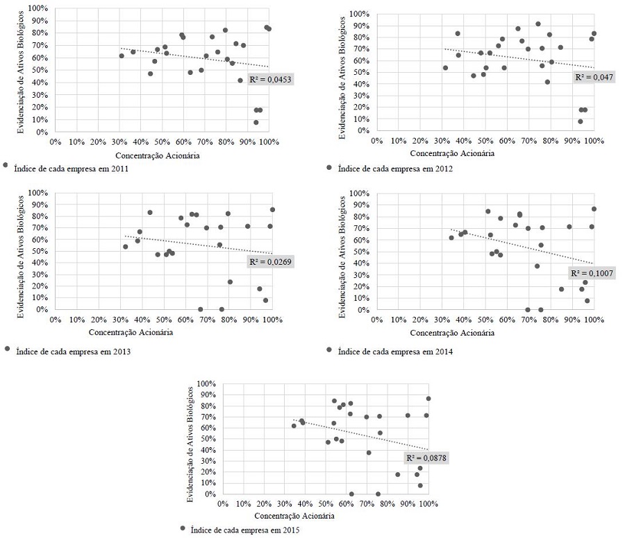 Os resultados encontrados para a amostra de empresas brasileiras de Agronegócio listadas na bolsa de valores (B3), de 2011 a 2015, indicam que as decisões de divulgação de ativos biológicos parecem não estar associadas à concentração acionária. Esse efeito pode ser atribuído justamente à alta concentração de capital generalizada no setor.