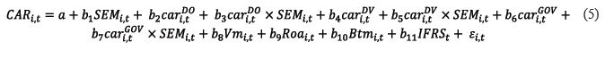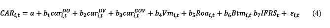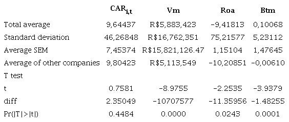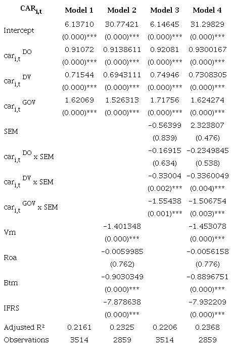 The variables CARi,t , cari,tDO, cari,tDV, cari,tGOV, Vm, Roa and Btm underwent a Winsorization process with a lower limit of 1% and an upper limit of 99%, which consists of replacing the values below and above the limit determined by the lowest and highest remaining values, respectively. It should be noted that the results are similar without the Winsorization process.