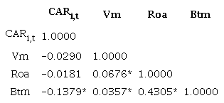 Table 3 shows the correlations between the control variables of the models and the dependent variable, showing a significant correlation between the dependent variable and the Btm variable, between the Vm variable and the Roa and Btm variables, and between the Roa and Btm variable.