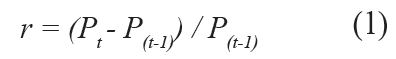 where r is the rate of return, Pt the share price in period t and P(t-1) is the share price in period t-1.