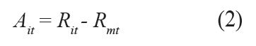 where Ait is the abnormal return of a given stock i in time period t, Rit is the observed return of the same share i in the same time period t and Rmt is the return of the market portfolio in period t.