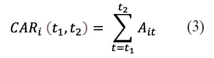 where CARi is the cumulative abnormal return of asset i, t1 is the first day of the event window, t2 is the last day of the event window and Ait is the abnormal return of a given stock i in time period t.