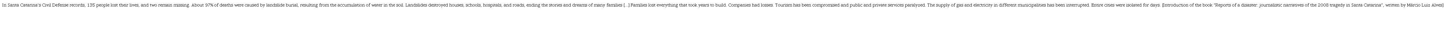 As was customary in the region, the entire month of November 2008 was marked by a period of heavy rain. However, in the last days of that month, the situation of alert became one of the biggest disasters in the state of Santa Catarina. Excessive rainfall in the Vale do Itajaí region had been recorded since September, and the first damage was noted on October 18. But on November 22, the state of Santa Catarina witnessed a true disaster, with a tragic balance of dead, missing, and homeless people, and incalculable public and private material damage (Box 1). The Vale do Itajaí region was reported nationally and internationally for going through its and one of Brazil’s worst disasters. After a period of heavy rain, the municipalities in the region - which are located on the banks of the Itajaí-Açu river - suffered from massive floods and landslides.
