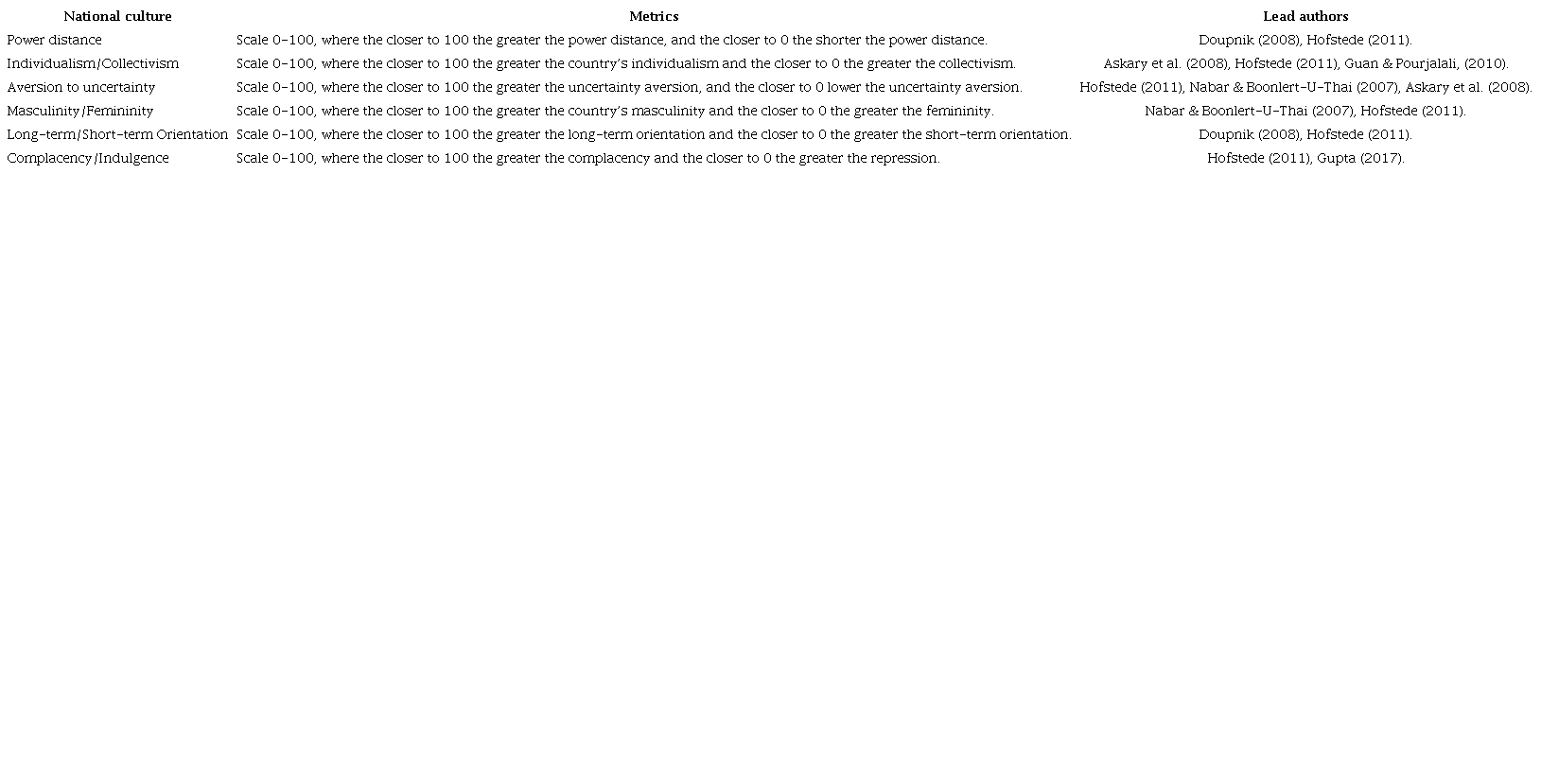 Hofstede (1983, 2011) identified the dimensions of national culture by which countries can be hierarchically organized, such as power distance, individualism vs. collectivism, uncertainty aversion, masculinity vs. femininity, long-term vs. short-term orientation, complacency vs. indulgence.