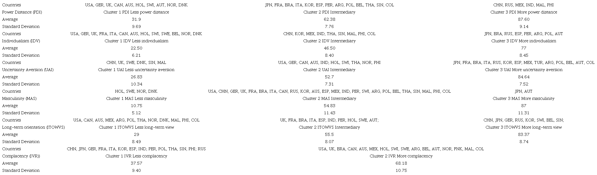 For data analysis, first the cluster by similarity of countries by national culture was prepared, using the cluster analysis. The conceptual model of the dimensions of the national culture of Hofstede (2011) was used, whose measuring scale was updated in 2015 (Hofstede Insights, 2015). In this respect, it was decided to form three clusters to segregate the countries in each national culture dimension.