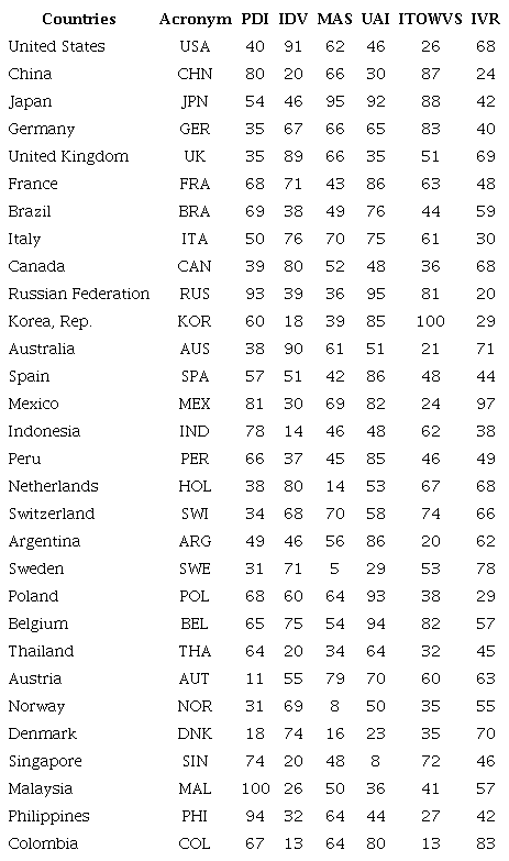 In relation to the countries, those that did not provide information about the dimensions of culture were excluded and substituted by the country with the next highest Gross Domestic Product. The 30 selected countries were: Argentina, Australia, Austria, Belgium, Brazil, Canada, China, Colombia, Denmark, France, Germany, Indonesia, Italy, Japan, Malaysia, Mexico, Netherlands, Norway, Peru, Philippines, Poland, Russia, Singapore, South Korea, Spain, Sweden, Switzerland, Thailand, United Kingdom and United States of America.