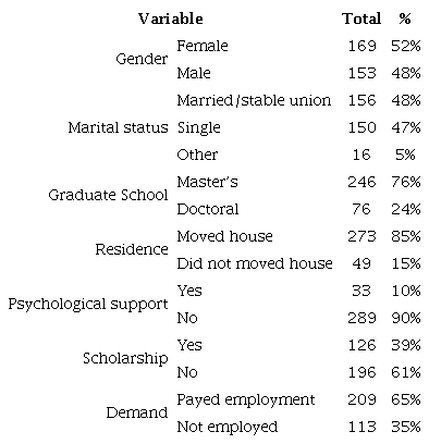 The submission of the research instrument to graduate accounting students via the Internet resulted in a sample of 246 master’s and 76 doctoral students from all master’s and doctoral accounting programs in Brazil. The respondents were 38 years old on average, the majority were female (52%), married (48%), who did not seek psychological support (90%) or scholarship (61%). The majority were in paid employment while attending the program (65%) (Table 1).