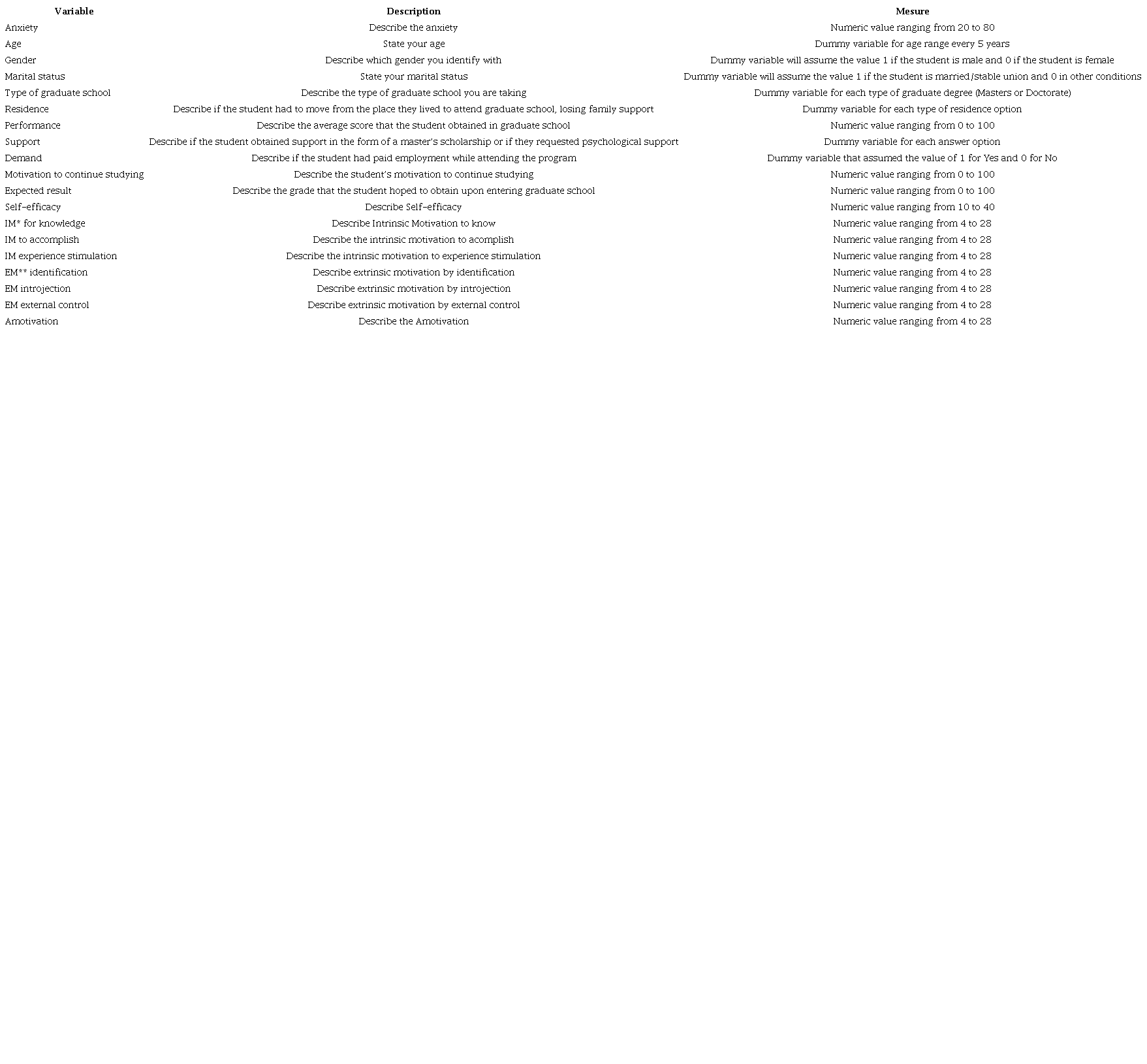 For systematization and data analysis, Microsoft Excel® and Stata 12® software were used, with a minimum significance level of 10%. The variables in this study were chosen based on the theoretical framework or the author’s perception of the influence of the variable on anxiety. Table 1 describes the variables used in the regression model.