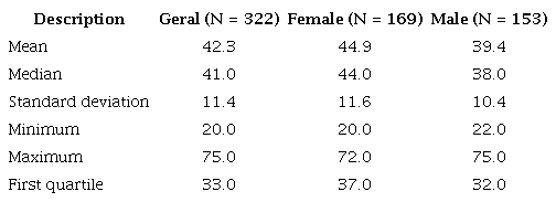 Female students reached, on average, 42.3 points, and male students, on average, 39.4. The A-trait scores observed in the analysis of both male and female students were higher than the scores of the study by Spielberger, Gorsuch, and Lushene (1979), which analyzed a sample of Brazilian university students in Rio de Janeiro (female 41.3 points; male 38.04 points).