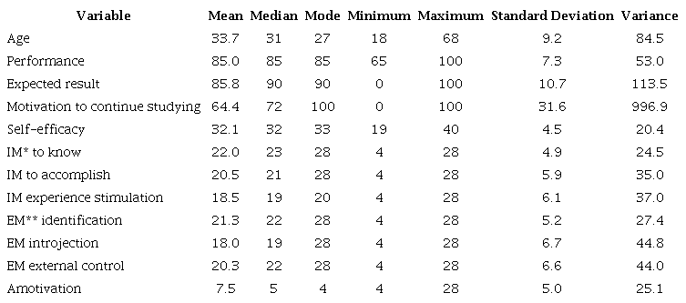As for the other research variables, the mean obtained from the respondents was 85.0 points. The mean was lower than the variable expected result (85.8) by only 0.8 points, which was not considered statistically different (normality test - p-value < .01, association test - p-value < .01). The variable motivation to continue studying reached approximately 64% of the maximum score, while the students’ perception of self-efficacy reached 80% of the maximum score. The results for the variables’ internal motivation to know (78%) and external motivation of identification (76%) stood out (Table 3).