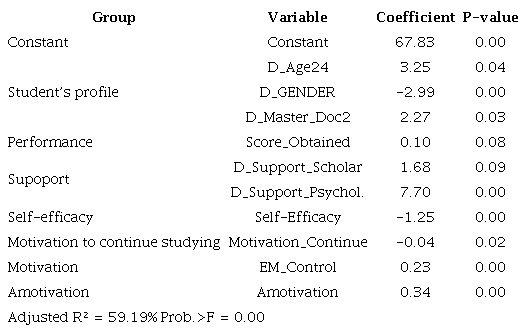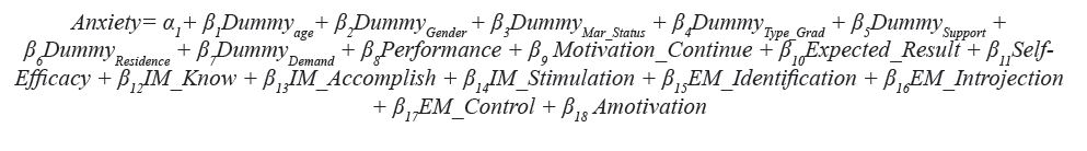 A multiple linear regression model was generated with the variable presented in Chart 1 using the backward stepwise technique, in which the dependent variable was anxiety. The control variables were: age, gender, marital status, type of graduate (masters or doctorate), support, residence, and demand. The explanatory variables were: performance, motivation to continue studying, expected results, self-efficacy, intrinsic motivation to know, intrinsic motivation to accomplish, intrinsic motivation to experience stimulation, extrinsic motivation by identification, extrinsic motivation by introjection, extrinsic motivation by external control, and amotivation, as presented in equation 1.