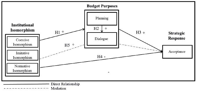 In this juncture, it is expected that institutional isomorphism increases the utility of budget purposes and thus influences the strategic response of acceptance, which are the purposes used to explain the relationship between isomorphism and acceptance. We point out, based on this context, that budget purposes can mediate the relationship between institutional isomorphism and the strategic response of acceptance. Given this, we can elaborate hypothesis 5: