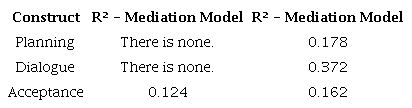 After validating the measurement model, we verified the R² (Pearson relationship coefficient) of each construct, which indicates how much of each dependent variable is explained by the independent variables.