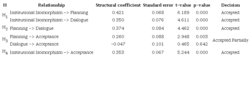 Hypotheses 1 and 2 were accepted, given that there is a significant positive relationship between institutional isomorphism and the budget purposes of planning and dialogue and between the utility of planning purposes and dialogue purposes. Hypothesis 3 was partially accepted, given that a significant positive relationship was found between planning purposes and the strategic response of acceptance. However, the relationship between dialogue purposes and the strategic response of acceptance was not only not significant, it had a negative coefficient, which was the opposite of what was expected. Hypothesis 4 was accepted, given that we found a significant positive relationship between institutional isomorphism and the strategic response of acceptance.