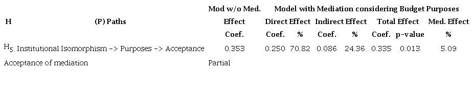 The evaluation of the mediation presented a lower path coefficient in relation with institutional isomorphism and the strategic response of acceptance mediated by budget purposes in comparison with the model without mediation, meeting the established criteria and indicating a partial mediation between the variables.