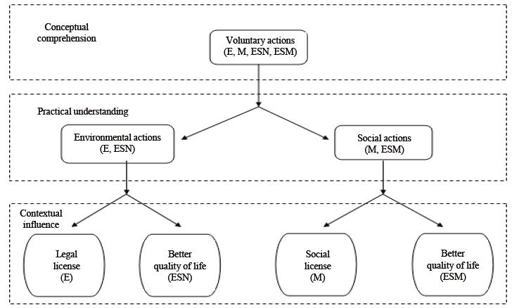 There is a pattern in how various agents understand CSR. This process is formed, first, from conceptual awareness and then from practical comprehension. Practical comprehension is directly influenced by the contextual awareness of each agent. This way of building meaning is what connects the state, the market, and civil society. At the same time, context and economic and social impacts caused by mining are also built into how those actors understand CSR. The influence of the economic and social impacts caused by an activity is the common point between representatives of the state.