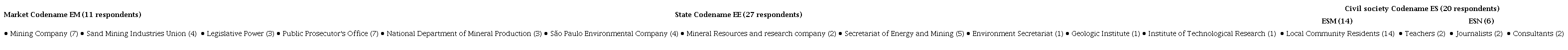 Finally, members of civil society, recommended by company representatives were interviewed. After that, we contacted locals and interviewed people who had benefited from CSR actions and, later, specialists who do not directly benefit from the activities of the company. For analytical purposes, agents of civil society were divided into two groups: local communities, represented by the acronym ESM and non-resident civil society, represented by the acronym ESN. This differentiation was necessary due to the different positions of these two groups inserted in the same segment. Table 1 explains the division of interviews in each segment of society.