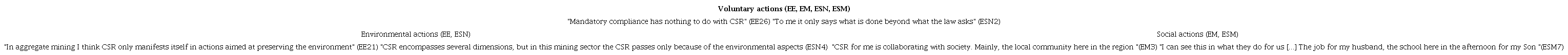 For the representatives of these segments studied - State, Market, and members of society (both resident and non-resident of local communities) - corporate social responsibility refers to activities beyond legal obligations. That is, it concerns only voluntary actions. Despite acknowledging the contribution of mandatory actions to society, the interviewees argue that abiding by the law does not constitute CSR. EE26 says: "Compulsory compliance has nothing to do with CSR. You must have to voluntarily start the initiative itself. Because what the law obliges you to do, the law obliges you to do". Mandatory actions have been cited as a minimum requirement that mining companies have to comply with to use a resource belonging to the Union. For ESN6: "I think he has to reciprocate. If he's using a natural resource, he must reciprocate, and only doing what they tell him to do doesn't count. It's the minimum they can do".