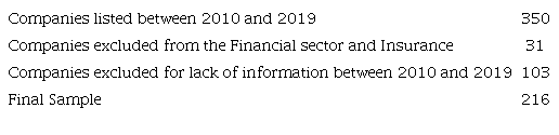 This is a quantitative research, which sought to collect evidence from empirical analyses. To this end, the sample was composed of all Brazilian non-financial publicly traded companies listed on B3, between 2010 and 2019. The chosen period is because Brazilian publicly held companies only adhered to the International Financial Reporting Standards (IFRS) as of the year 2010, and the reference forms used for elaborating the variables were only available at the website of the Brazilian Securities and Exchange Commission (CVM) from that same year. Table 1 summarizes the research sample.