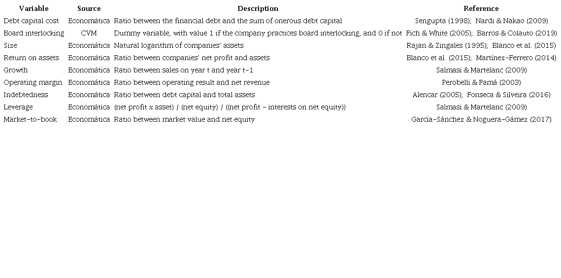 According to Rajan and Zingales (1995) and Blanco et al. (2015), the larger the company, the better its credit history and reputation in the market, resulting in a lower debt cost. Thus, a negative relationship between debt capital cost and companies’ size would be expected. Finally, Miller (1977) observes that tax payment decreases the benefit generated by financial leverage in loss compensation for tax authorities. Therefore, tax payment on their results would require from creditors higher interest rates on credit operations (Salmasi & Martelanc, 2009). Hence, a positive relationship between financial leverage and debt capital cost would be expected. Table 2 summarizes the research variables.