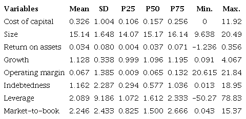 Initially, I carried out a data descriptive analysis in order to observe the behavior of information on the variables. Descriptive analysis reported the mean, standard deviation, the 25th, 50th and 75th percentiles, as well as the maximum and minimum values of each variable. Debt capital cost showed a mean of 0.32692, representing approximately 32% of the amount of third-party debts. However, this value does not express faithfully the sample data, since the 75th percentile is below this value, showing that 75% of the companies have financial expenses below 25%, regarding loans, funding, and debentures. Table 3 summarizes the values for each variable.