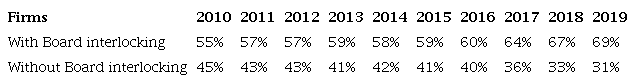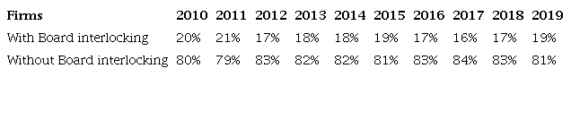 Table 5 shows that the percentage of companies that practiced board interlocking with companies in the financial sector between 2010 and 2019 varies between 16% and 21%. According to the Bank Control Theory (Mintz & Schwartz, 1985), these firms share counselors with companies in the financial sector because they depend heavily on debt capital.