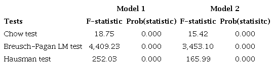 The prob (statistic) value of 0.000 in Chow test indicates that, between the Pooled and the fixed effects methods, the latter should be used because it rejects the null hypothesis. The prob (statistic) value of 0.000 in the Breusch-Pagan LM test indicates that, between the Pooled and the random effects methods, the latter should be used because it rejects the null hypothesis. Moreover, the prob (statistic) value of 0.000 in the Hausman test indicates that, between the random effects and the fixed effects methods, the latter should be used because it rejects the null hypothesis.