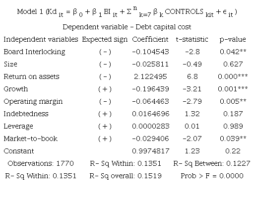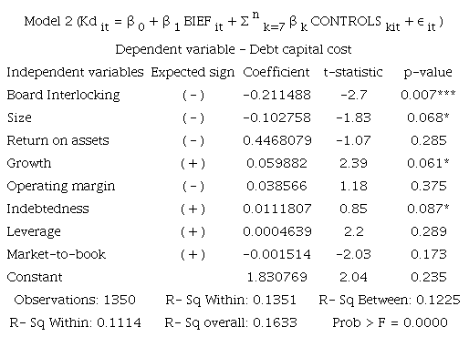 The results show that there is a statistically significant and negative relationship between the variables BIEF and Kd. Previous research has shown that one of the reasons for companies to use board interlocking is to raise external resources, especially financial. Therefore, our results show that companies that share counselors with financial firms have a lower debt capital cost, thus confirming the results achieved in Model 1.
