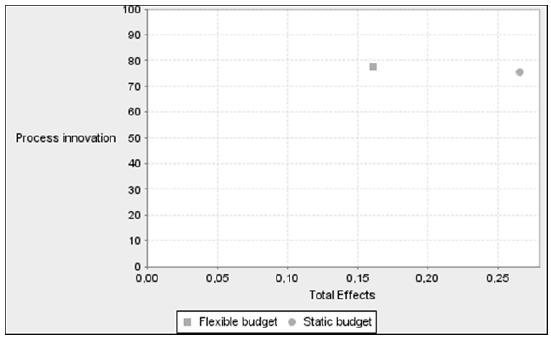 Figure 3 demonstrates static budget (performance: 75.608, importance: β=0.188) and flexible budget (performance: 77.747, importance: β=0.201) in fostering product innovation. Static budget has greater importance in process innovation, while flexible budget presents greater importance in product innovation. As for performance, there is little difference, with slightly higher trend for flexible budget compared to static budget, in both technological innovations.