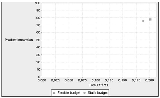 The IPMA basically considers importance (total effects, on the x-axis) and performance (average score of the constructs, on the y-axis). Although static budget (75.608) and flexible budget (77.747) show similar performances, static budget (β=0.266) has higher importance (total effects) than flexible budget (β=0.161) in process innovation. Figure 3 shows the IPMA analysis for product innovation.