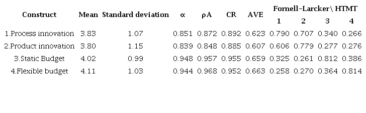 First, the measurement model (Table 1) of the PLS-SEM (Hair Jr., Hult, Ringle & Sarstedt, 2017) was evaluated. One item of the flexible budget construct was excluded for the adjustment of the model since it did not fit in the confirmatory factor analysis. This flexible budget item consists of "determining operating volumes," and its low factorial load (<0.70) indicated some misalignment with the other items of the construct for the present sample (Hair Jr. et al., 2017). After its exclusion, the remaining indicators have adequate factorial load (≥0.70) in their respective construct (Hair Jr. et al., 2017).