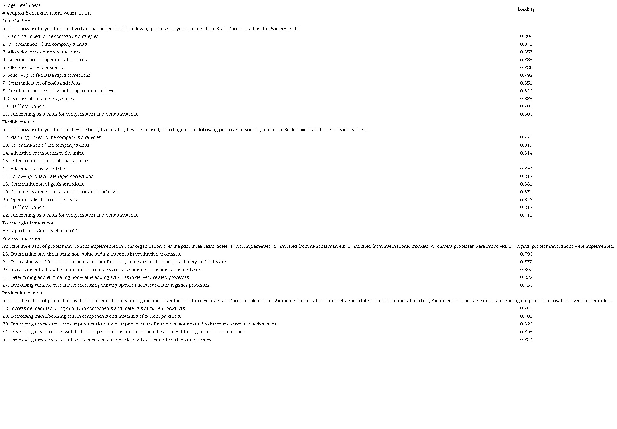The limitations of the present research may represent new research opportunities. First, the data should be generalized cautiously since the sample comprises exclusively companies benefited by the Brazilian Law of Good, which indicates the need for new studies with other samples, for possible comparisons. Second, as innovation enabling MCS, only static and flexible budget were considered. Therefore, future studies may contemplate other types of MCS. Third, the study considered the symmetric relationship of budget (static and flexible) in technological innovation, but further research can explore the interdependence and complementarity of the MCSs, through asymmetric analysis, such as fuzzy-set qualitative comparative analysis. Also, no control variables were used, which may be considered in future research.