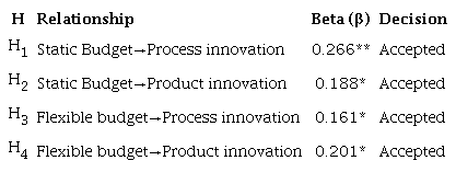 Hypothesis H2 proposes that the use of static budget is positively and significantly associated with product innovation, and is statistically accepted (β=0.188, p<0.10). Static budget receives considerable importance (β=0.188) and performance (75.608). This evidence matches the literature, that when static budget is used in the planning framework, it is positively associated with product innovation (Dunk, 2011). It is perceived that the usefulness of static budget is aligned with the development, improvement or creation of the attributes of goods/services (OECD, 2005).