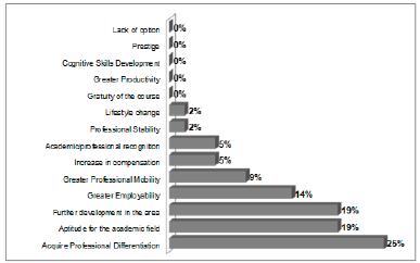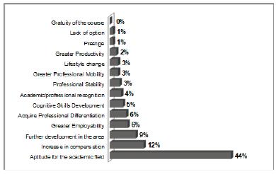 In summary, as expected, the aptitude for the academic area was the main reason listed by Master’s and Doctoral students in the academic modality, considering that the objective of this modality is precisely to enable the student to exercise the teaching career, being essential for this aptitude for the area. In the professional modality, the highlight was the item acquiring professional differentiation, which was also an expected result for this modality. An interesting result was observed in the item aptitude for the academic area, listed by 19% of students, even though they have chosen the modality of professional education to the detriment of the academic one, which was perhaps the most appropriate in these cases.