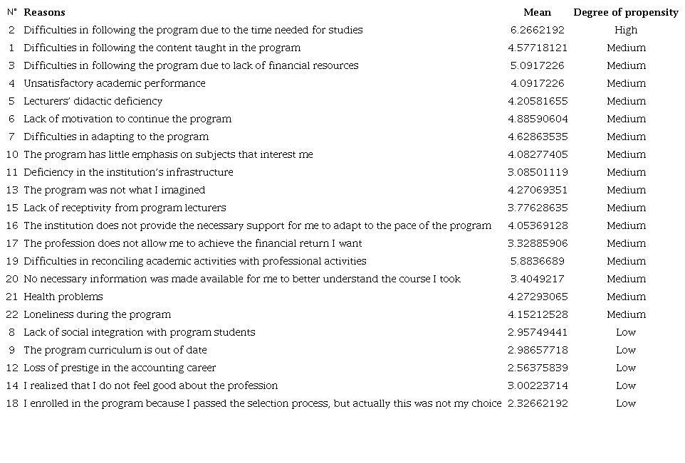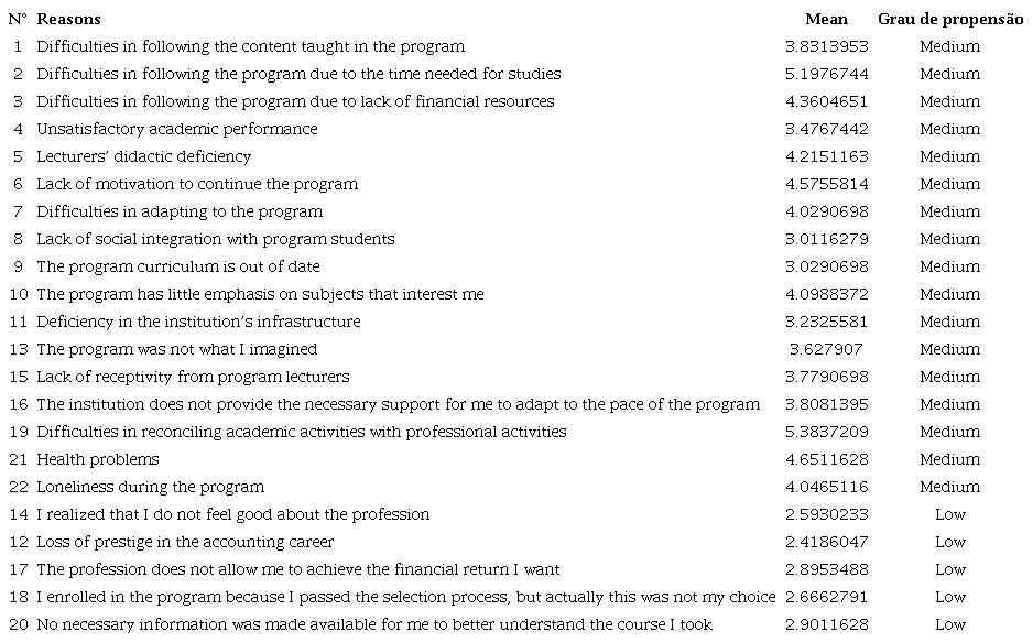 Through the mean of the scores assigned by students enrolled in graduate programs in Accounting in the third part of the research instrument, it was possible to identify the reasons that would most contribute to attrition. The reason was considered as having a low degree of evasion propensity when the mean of the scores assigned was between 1 (one) and 3 (three); as of medium degree of evasion propensity when the mean of the scores assigned was above 3 (three) and below 6 (six); and, as a high degree of evasion propensity when the mean of the scores given was above 6 (six).