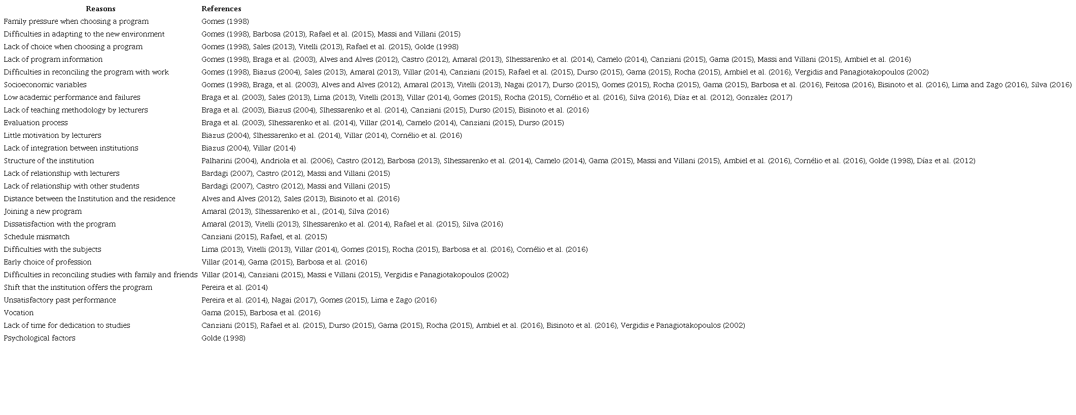 The search for the reasons behind attrition has been the object of national and international research, with special attention to higher education courses (Gomes, 1998; Vergidis & Panagiotakopoulos, 2002; Andriola et al., 2006; Adachi, 2009; Alves & Alves, 2012; Castro, 2012; Díaz et al., 2012; Barbosa, 2013; Sales, 2013; Silva, 2013; Slhessarenko et al., 2014; Camelo Neto, 2014; Pereira et al., 2014; Rafael et al., 2015; Silva, 2016; Gama, 2015; Ambiel, 2015; Barbosa et al., 2016; Cornélio et al., 2016; Feitosa, 2016; Bisinoto & Arenas, 2016; Ambiel et al., 2016).