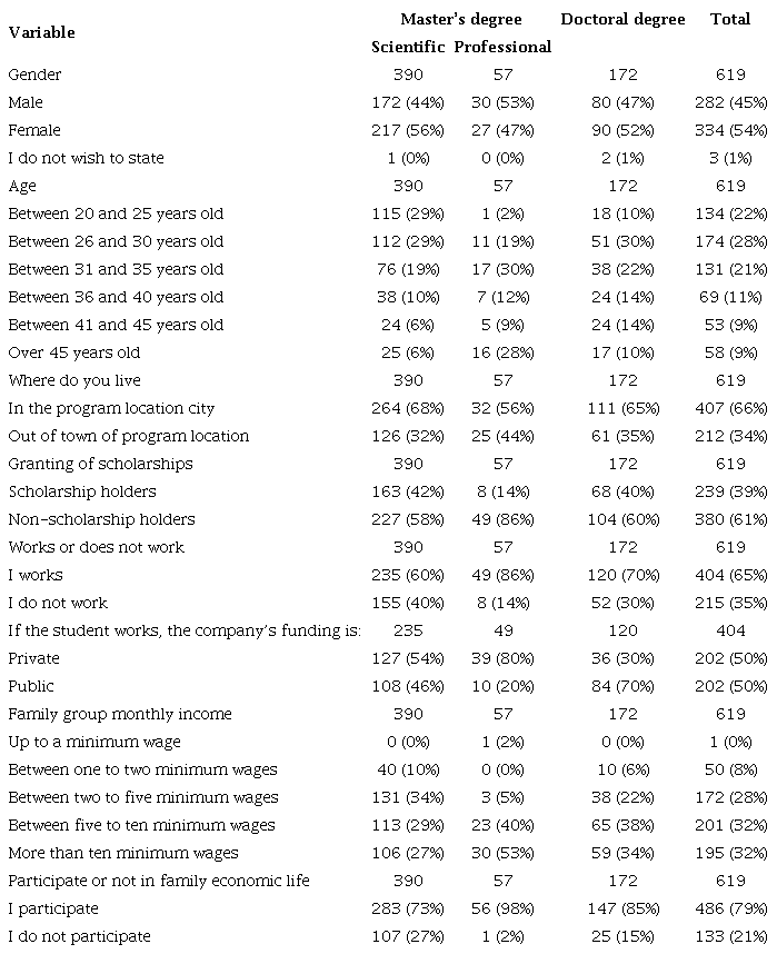 Regarding the 172 doctoral students who participated in the research, predominantly, are female, aged between 26 and 30 years old, live in the same city as the course, do not have scholarships, work (especially in the public initiative), have a family income between five and ten minimum wages and participate in family economic life.