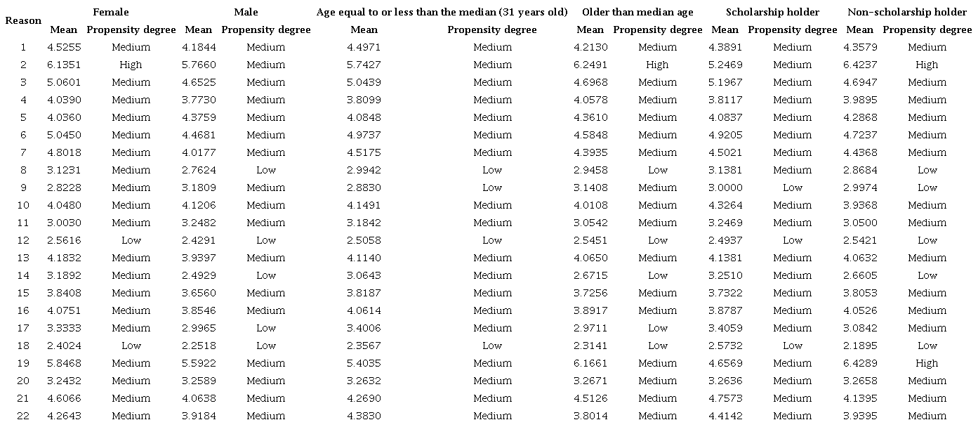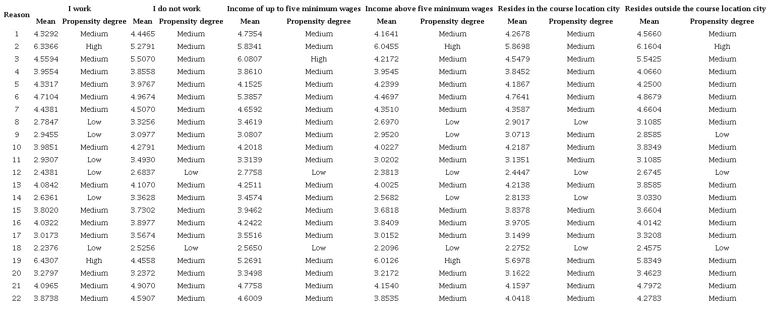 Finally, the last characteristic analyzed was the fact that the student resides in the city where the program is located or outside it. Students who live outside the city where the course is located, indicated the difficulties in following the program due to the time needed for studies (reason 2, mean = 6.1604) as the reason that would most contribute to evasion, representing a high degree of propensity. Students who reside in the city where the program is located did not indicate reasons that would represent a high degree of contribution to the propensity for evasion.
