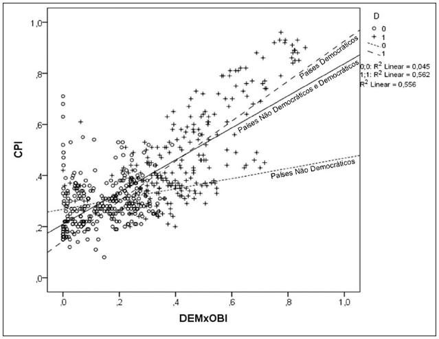 The observations of the CPI results and of the OBIxDEM multiplication are broken down below, discriminating them by dummy groups in order to identify the observations of democratic or undemocratic countries (Figure 1). The results of both regressions are represented, one referring to the group of observations of undemocratic countries (short dash line, R² 0.045) and the other to the observations of democratic countries (long dash line, R² 0.562). We also added the discrimination of the main regression (referring to the results in Table 1 of all the observations together, which relate to undemocratic and democratic countries) of the observations in general (solid line, R² 0.556).