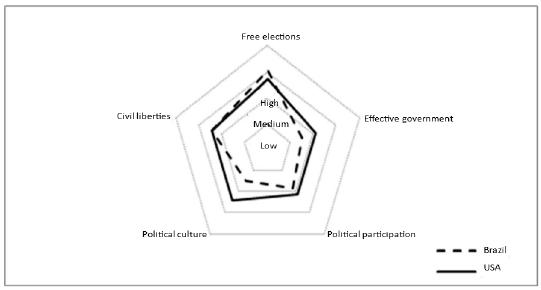 We now show the levels of democratic institutions in Brazil and the USA, with three levels (low, medium and high). We used data for 2017, based on the results by elements of the calculation of the democracy index (Figure 2).