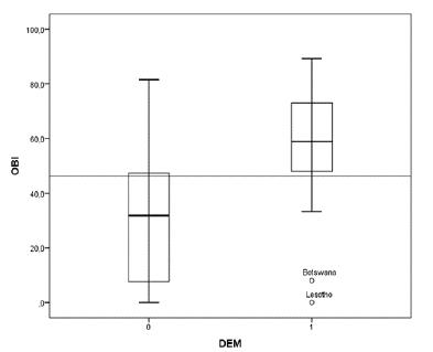 However, and still with regard to Brazil and the USA, multiplying the OBI and DEM values (to cause an interaction between these variables) we obtain results of 0.53 and 0.61, respectively. We conclude, therefore, that the effect of the interaction between DEM and OBI fits with the approximation with the CPI results. In other words, this is evidence that the results of the perception of corruption are moderated by democracy based on the level of fiscal transparency.