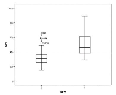 Based on Figures 3 and 4, and on an analysis of their quartiles, we can confirm that the results of the group of undemocratic countries show little fiscal transparency or a perception of corruption, while the results of the group of democratic countries are much better. This finding is reinforced when we compare all the observations of the groups with the median lines plotted in the figures in question.