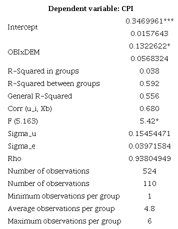 Based on our objective, the literature review and the methods presented, we examined the relationship between fiscal transparency, democratic institutions and corruption perception. The results of the tested model are shown in Table 2, with perception of corruption (CPI) as the dependent variable, and the result of the multiplication of the independent variables, democratic institutions and fiscal transparency (DEMxOBI).