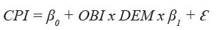 We tested the interaction of DEM with OBI on the CPI results using the hypothetical proposition that is mathematically detailed below: