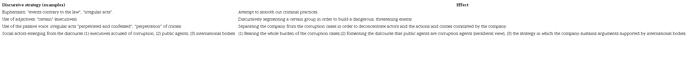 In this section, the study focuses on how discourses can emerge from accounting reports from a discursive perspective, with regard to corruption. Thus, the section debates linguistic aspects such as vocabulary, grammar, textual structure and social actors which are part of discourse. Some discursive strategies such as euphemism, the use of adjectives and the passive voice, as well as the presence of certain social actors, were found in the JBS reports, as highlighted in the chart below and detailed over the analysis: