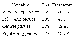 GDP: represents the local community’s economic base, allowing to control for the effects of wealth difference between these municipalities. Thus, the municipalities with greater GDP possess greater wealth. Therefore, they have greater possibilities of achieving a good financial condition. The analysis of the dummy variables used as control variables shows, in Table 12, the frequency of mayor experience and the participation of parties according to their ideological representation.