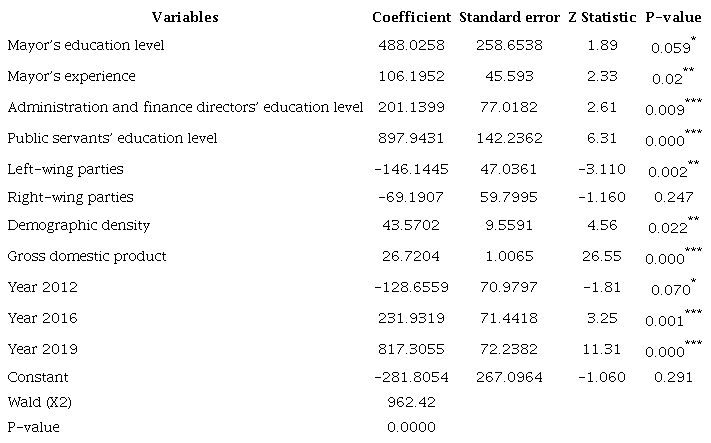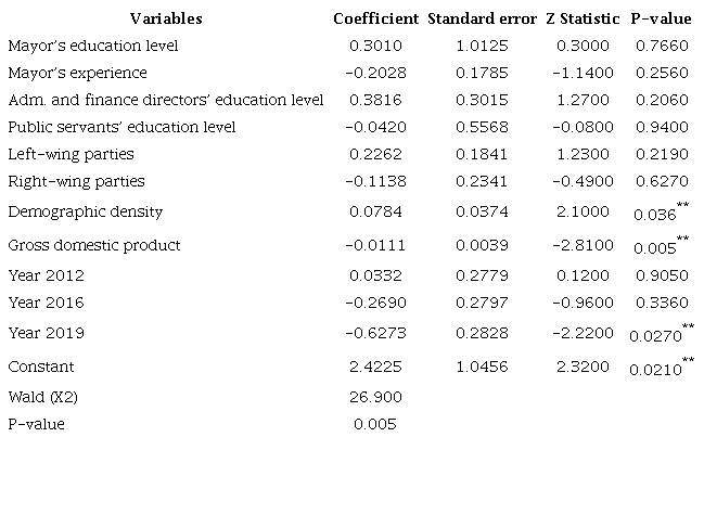 Regarding the control variables, the variable characterized by the ideology of left-wing parties have presented a negative influence (-3.110), significant at 5%, showing that left-wing parties have presented a negative influence on the financial condition of cash solvency of large Brazilian municipalities. These findings counter the studies of Avellaneda and Gomes (2017) and Gomes et al. (2013), since the evidence gathered in these studies has indicated the absence of ideological influence of parties on the financial performance of Brazilian municipalities.